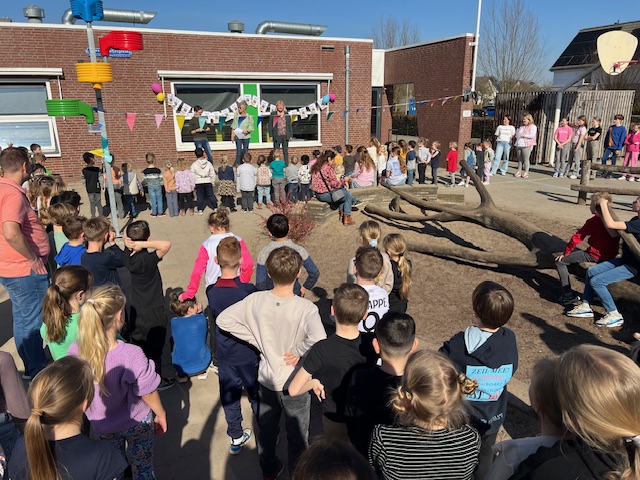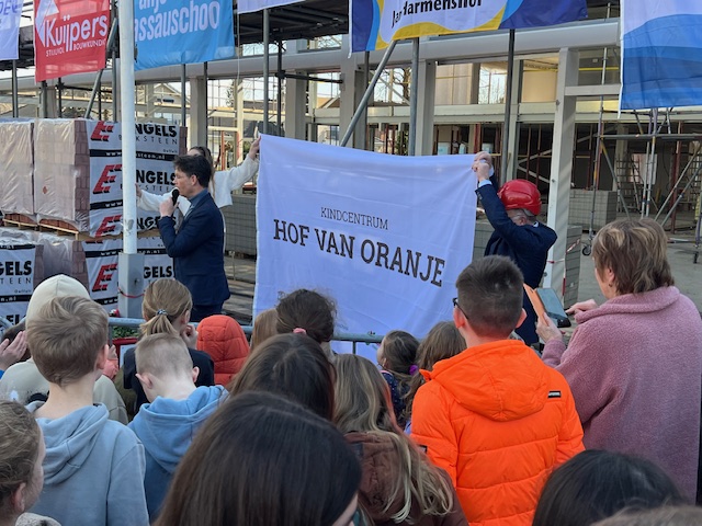 Daarnaast vierden we ook de nieuwe naam en het hoogste punt van de nieuwbouw in Geldermalsen. De Jan Harmenshof, de Oranje Nassauschool en Chapeau kinderopvang gaan daar eind dit kalenderjaar in een prachtig nieuw kindcentrum samen verder onder de naam “HOF VAN ORANJE”. Met alle leerlingen onthulde onze kinderburgemeester samen met de wethouder deze naam afgelopen woensdag.